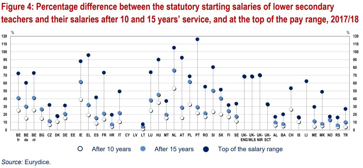 The potential for salaries to increase over a teachers’ career also varies considerably. In countries like Greece, France, Luxembourg, Hungary and Austria the salary for teachers with the most years of experience is up to 70 % higher than the starting salary. For example, a newly qualified teacher in Austria starts on €35 205, compared to €72 763 at the top of the salary scale. However, it takes between 29 and 42 years of work to reach these higher levels.