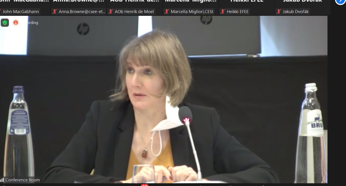 Jitka Hrudova, from the European Commission’s DG Employment, presented the ongoing Review of sectoral social dialogue at EU level. She was followed by Géraldine Libreaux, from DG EAC (Education, Youth, Sport and Culture) who shared the Commission report on how to recruit, train and motivate qualified staff in Early Childhood Education and Care. Her colleague Stefan Zotti delivered a keynote speech on ensuring qualitative and sustainable investment in education in the time of recovery from the COVID-19 pandemic, sharing some of the key findings of the Commission expert group on quality investment in education.