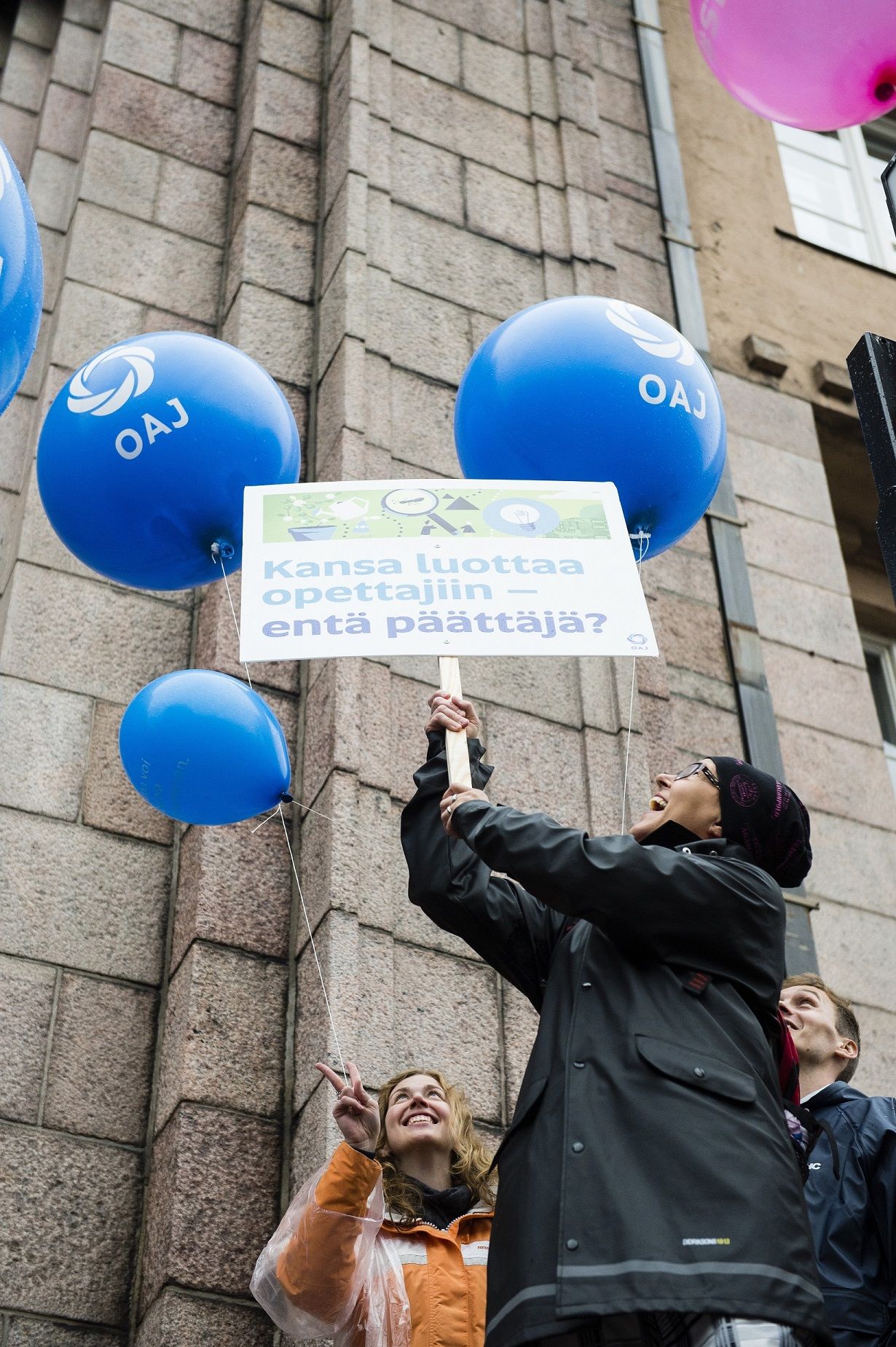 Despite the heavy rain, a huge crowd of committed trade unionists followed the call waiting for explanations from those political parties who have been behind the current plans to infringe the negotiations rights. The teacher union OAJ as the biggest union in AKAVA was in the front line of the demonstration. Here, the federation showed the yellow card to the government. “ The red card is still in our back pocket but we hope we won’t need to show it”, said OAJ chairman and AKAVA vice chairman Olli Luukkainen.