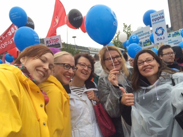 По сведениям профсоюза OAJ, финской членской организации ETUCE, пятница на прошлой неделе была необычным днем для всего профсоюзного движения в Финляндии. По разным оценкам более тридцати тысяч членов профсоюзов собрались в Хельсинки для защиты своих прав на ведение переговоров. Три федерации профсоюзов под названием SAK,STTK и AKAVA призвали своих членов выйти на улицы и принять участие в массовой демонстрации. Несмотря на проливной дождь, огромная толпа активных профсоюзников отозвалась на призыв потребовать ответа у политических партий, стоящих за текущими планами правительства урезать переговорные права профсоюзов.